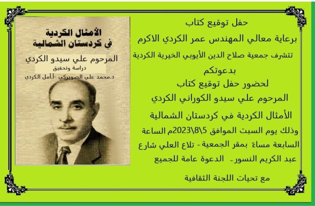 سيتم حفل توقيع كتاب المرحوم علي سيدو الكردي بعنوان الامثال الكردية بكردستان الشمالية من اعداد وتقديم الاستاذان محمد علي الصويركي وأمل محي الدين الكردي – يوم السبت – الساعة السادسة والنصف – الدعوة عامة للجميع